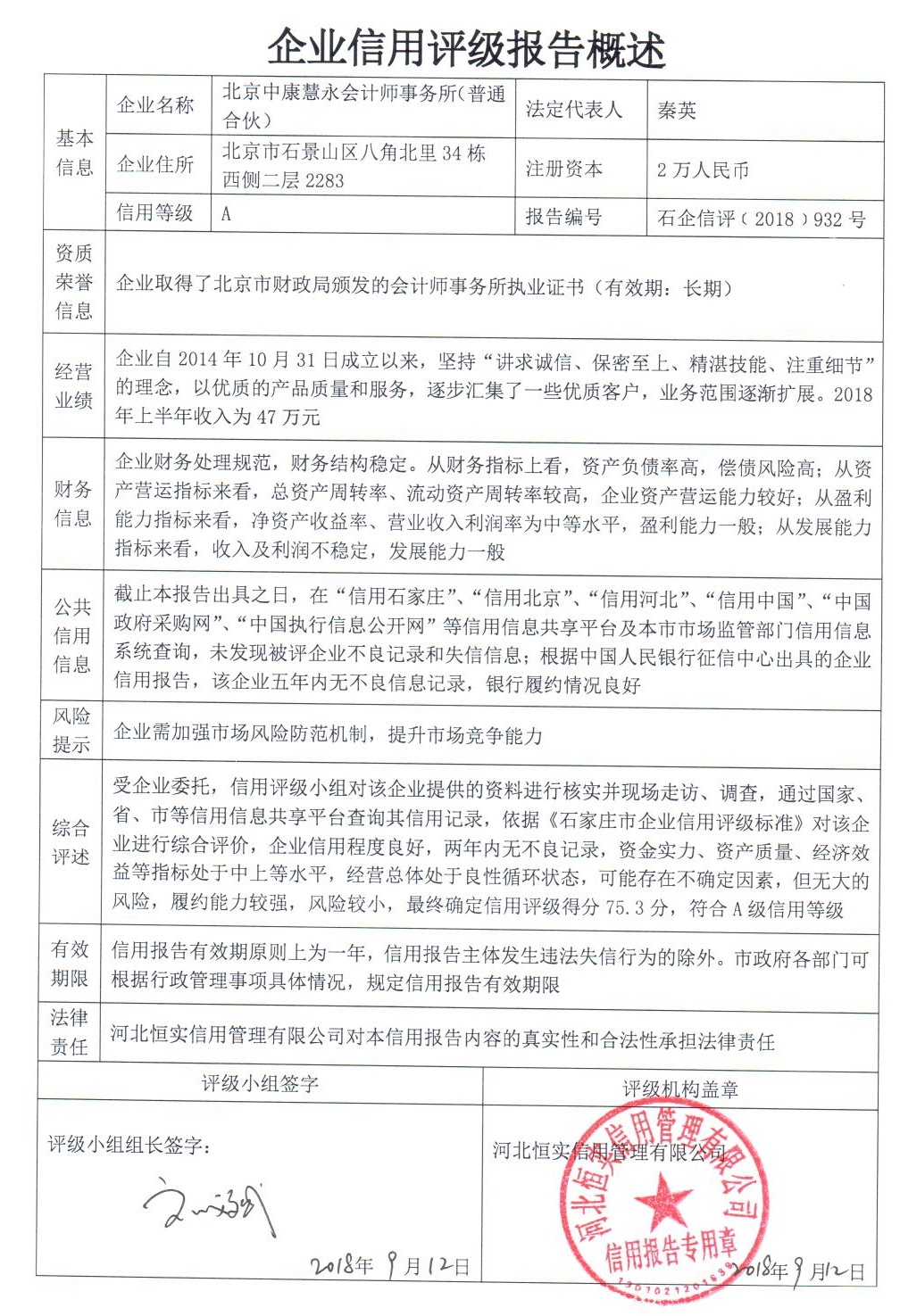 北京中康慧永会计师事务所(普通合伙)
